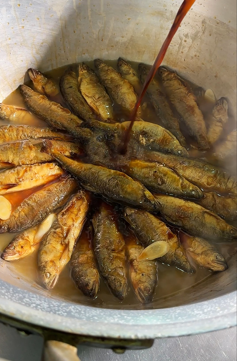 選用來自台灣純淨水域的100%在地香魚,肉質緊實而細膩,歷經漫長熬煮仍保持完整優雅的姿態。魚骨在溫火中化為柔嫩,入口即化,免除挑骨的繁瑣。經由匠人之手精準烹煮,魚體呈現透亮的焦糖色澤,如琥珀般誘人,在器皿間散發低調的光輝。